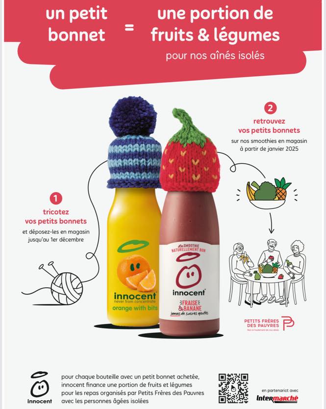 Concrètement, pour chaque petite bouteille de jus ou smoothie innocent coiffée d’un petit bonnet en laine, innocent finance une portion de fruits et légumes pour les repas organisés par les Petits Frères des Pauvres.