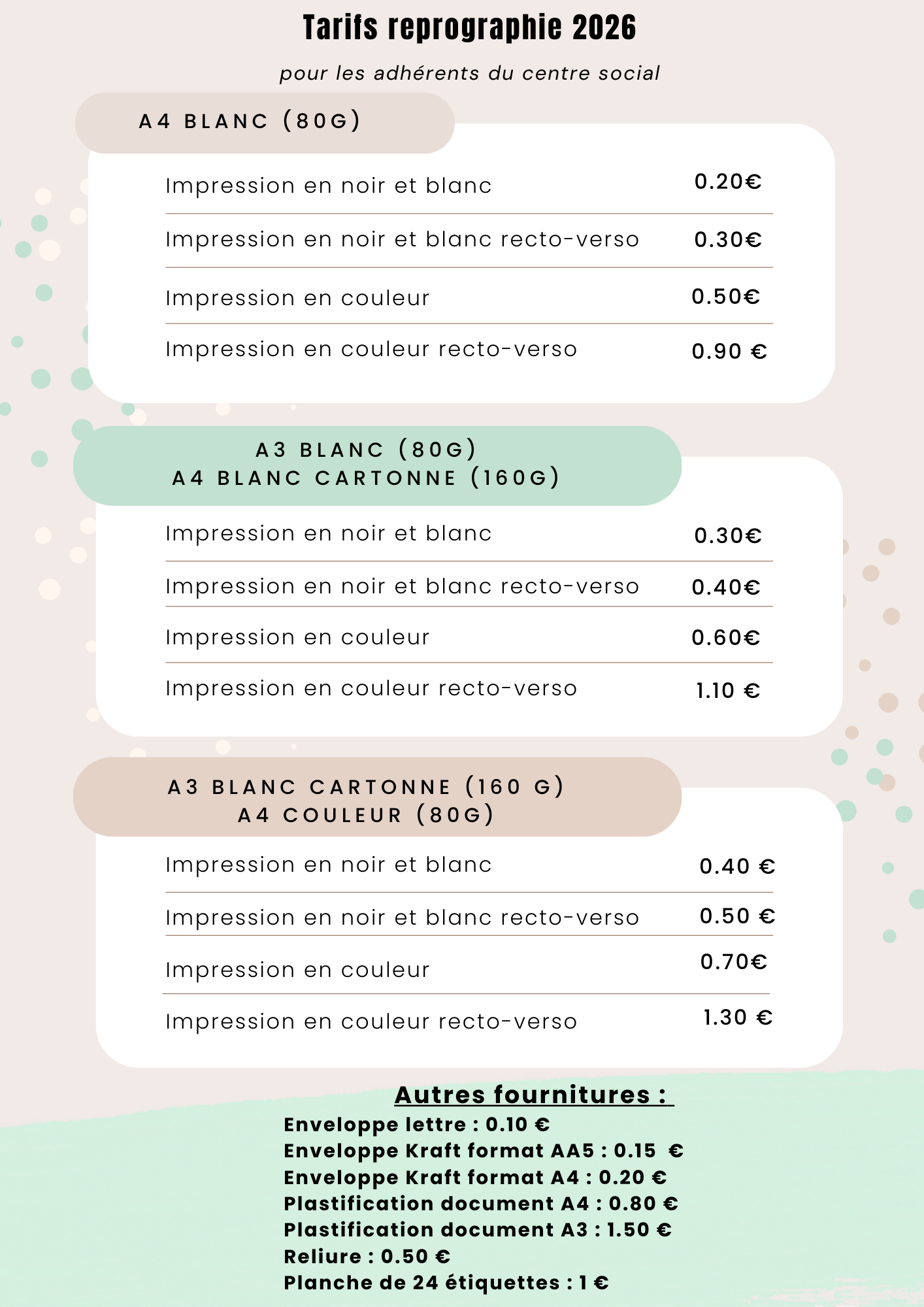 Vous trouverez ci-dessous les tarifs du service reprographie de notre association :